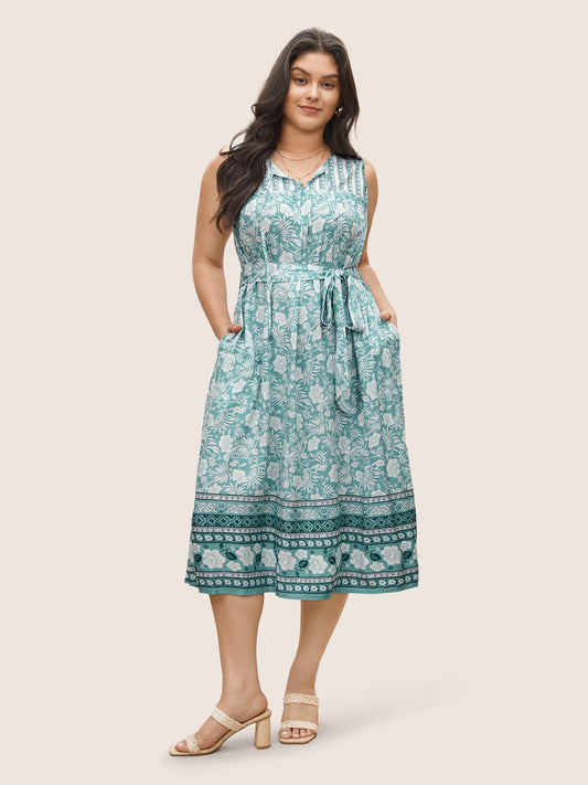 Boho Print Tie Neck Belted Pleated Dress