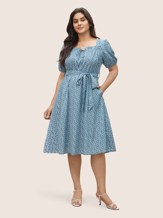 Square Neck Floral Print Gathered Drawstring Dress