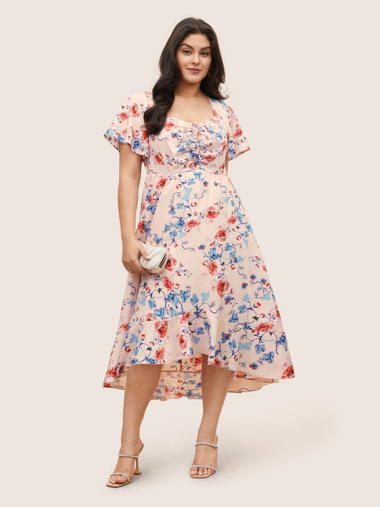 Floral Print Shirred Front Ruffle Sleeve Dress