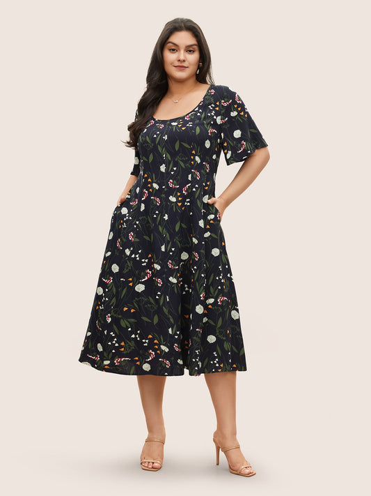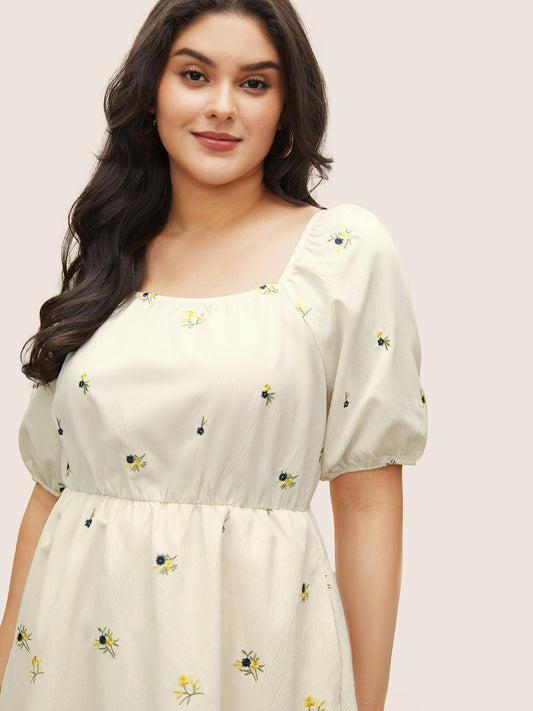 Ditsy Floral Embroidered Square Neck Elastic Cuffs Dress