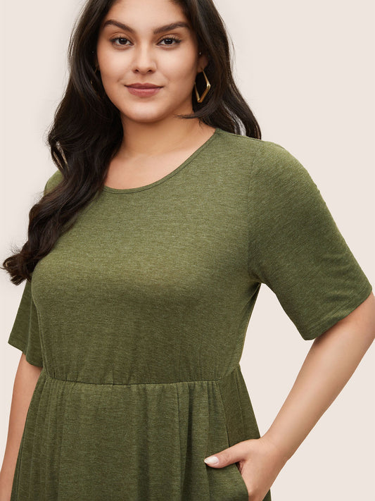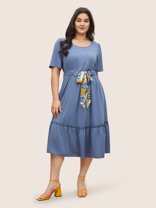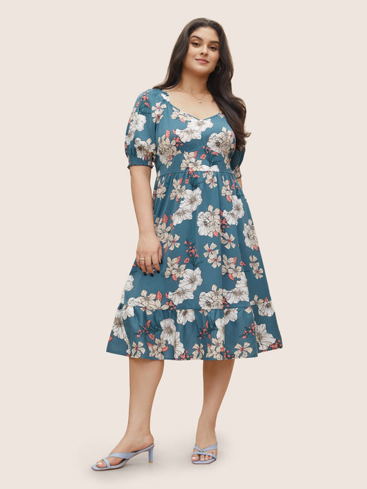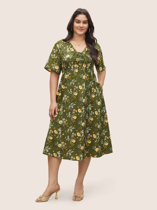 Floral Frill Trim Shirred Pocket Square Neck Dress