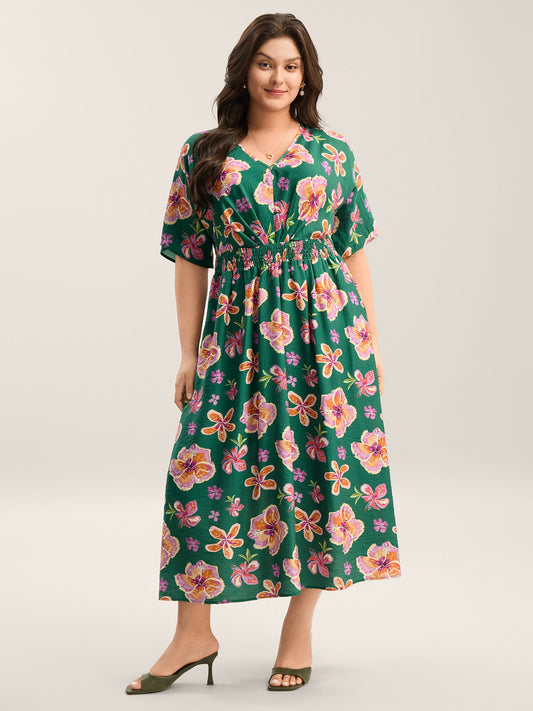 Stripes Button Tab Sleeve Pockets Midi Dress
