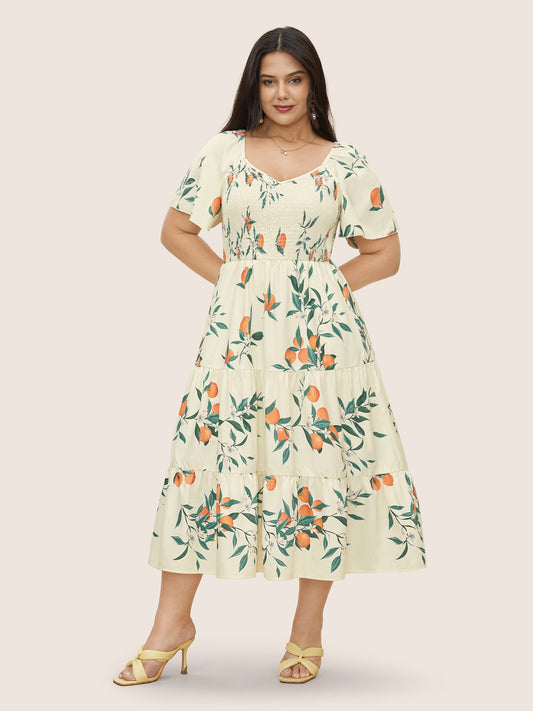 Citrus Orange Print Heart Neckline Ruffles Shirred Dress