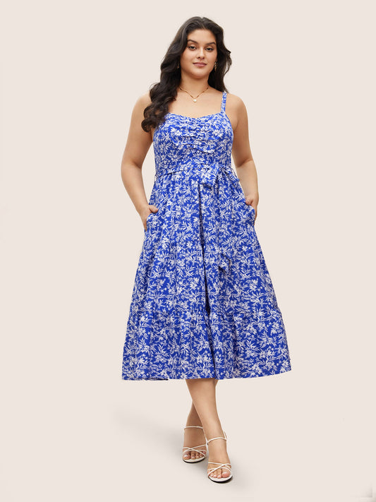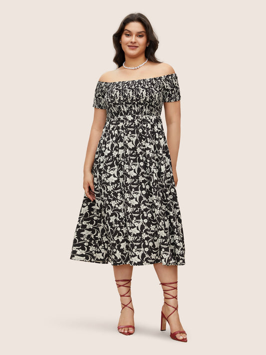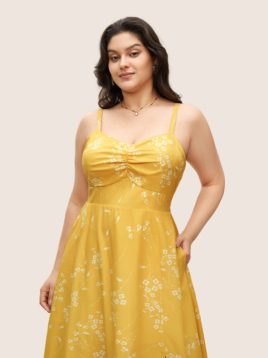One Shoulder Neck Floral Shirred Slit Hem Dress