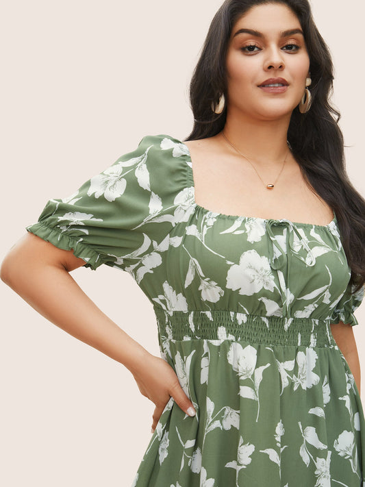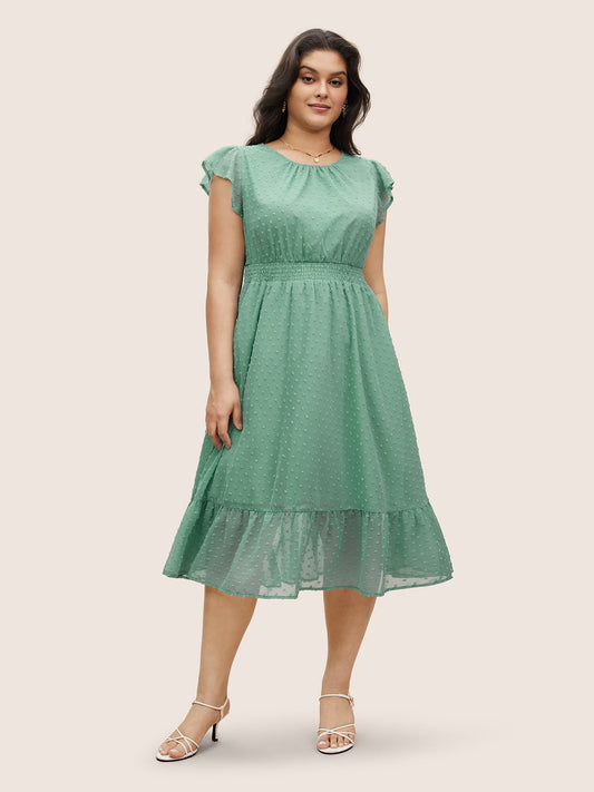 Anti-Wrinkle Square Neck Scalloped Trim Ruffle Sleeve Dress