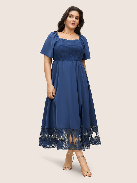 Square Neck Shirred Lace Trim Slit Hem Dress