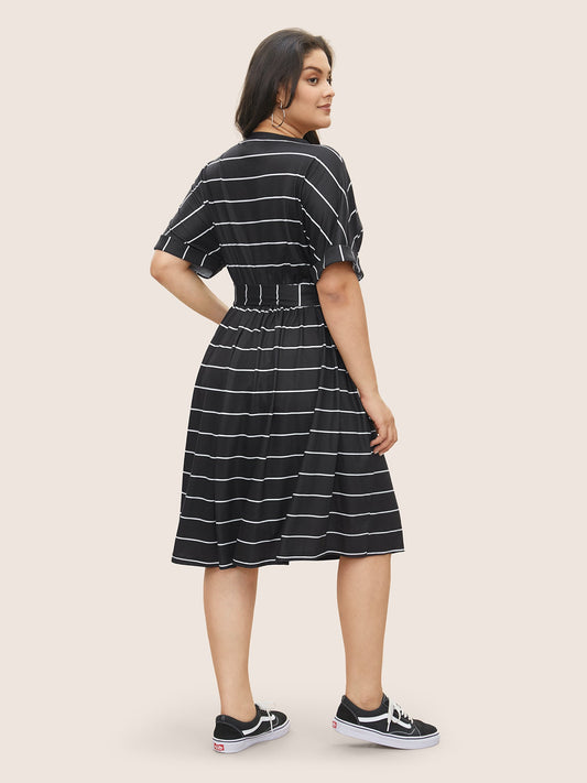 Striped Batwing Cuffed Sleeve Belted Dress