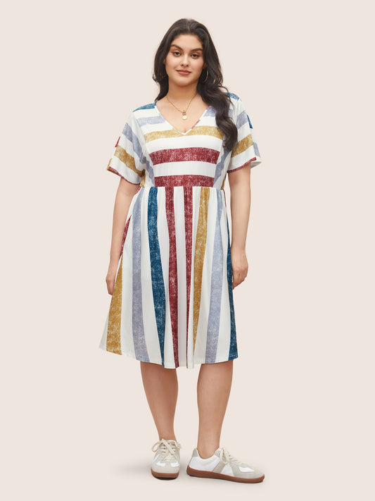 Striped Geometric Surplice Neck Belted Dress