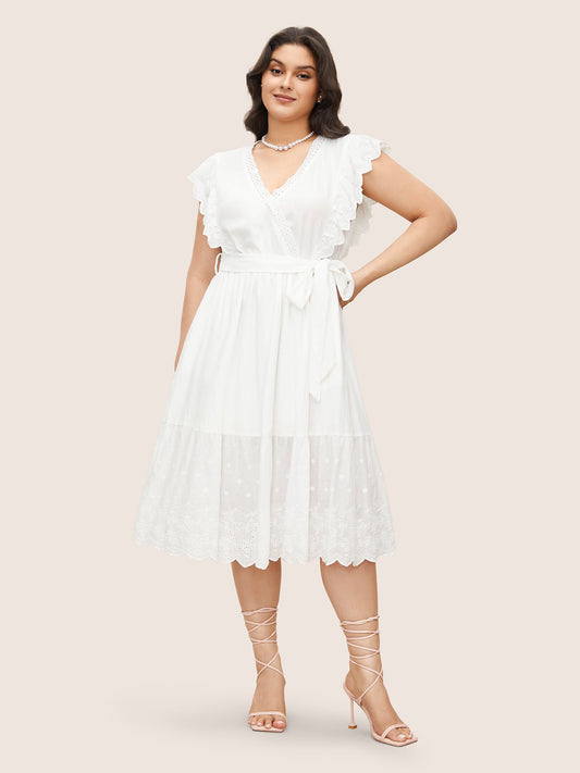 Plain Overlap Collar Ruffles Belted Dress
