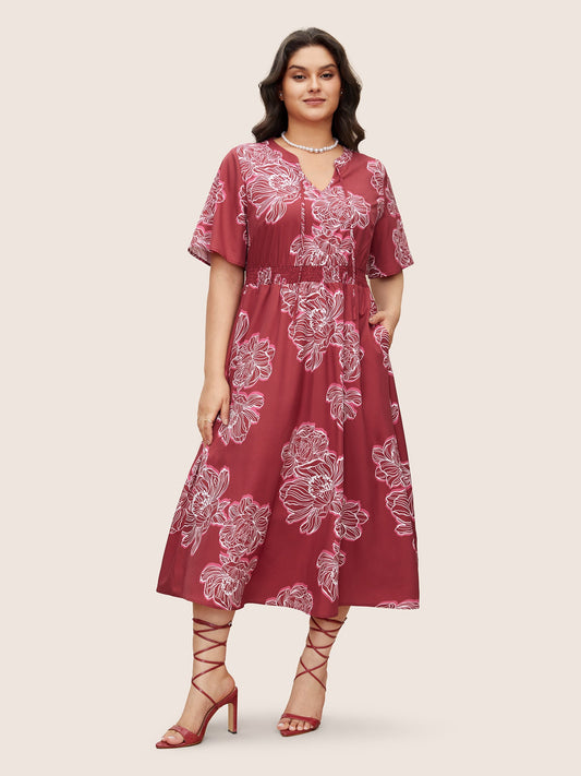 Floral Knot Neck Shirred Ruffle Sleeve Dress