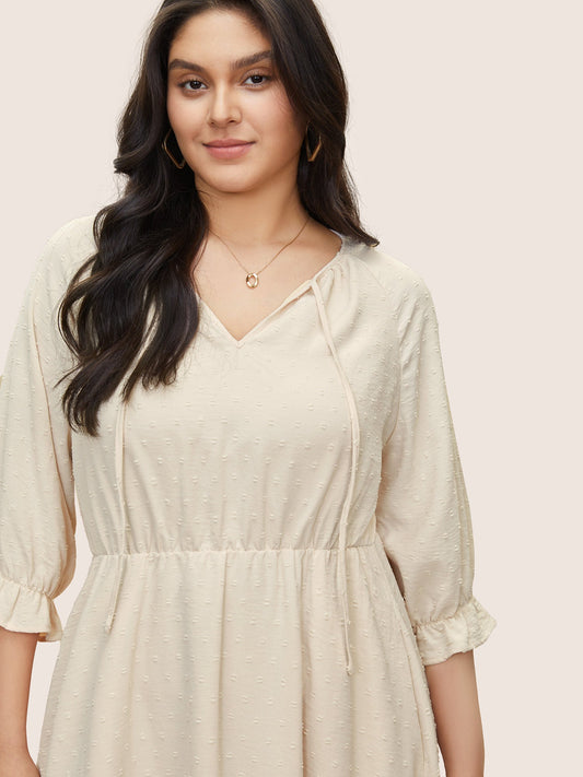 Plain Textured Elastic Waist Tie Neck Ruffles Dress