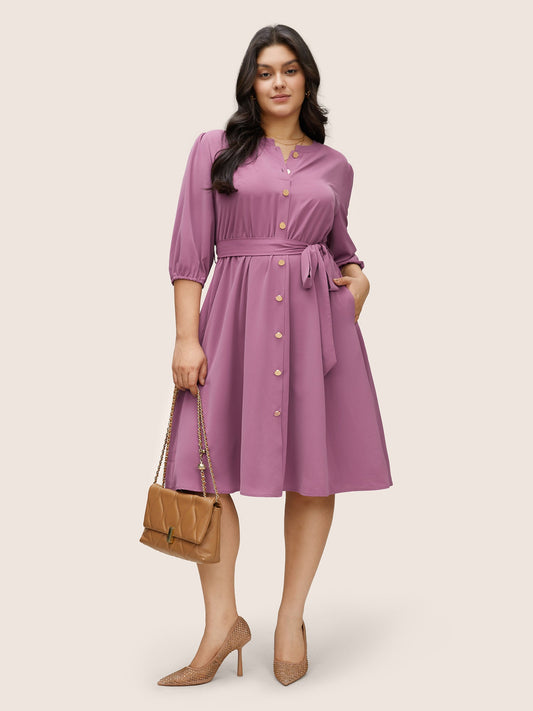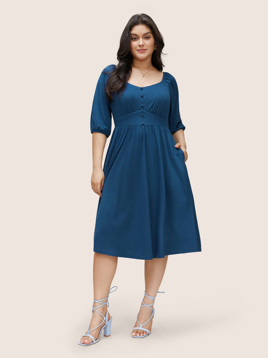 Plain Gathered Button Detail Lantern Sleeve Dress