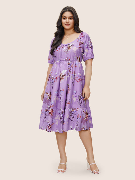 Floral Print Ties Scoop Neck Flutter Hem Dress