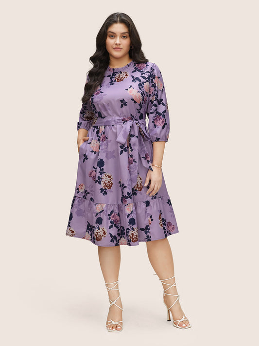 Ditsy Floral Notched Pocket Lantern Sleeve Dress