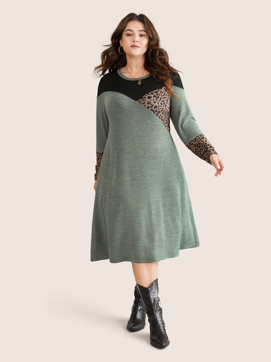Leopard Patchwork Colorblock Contrast Round Neck Dress