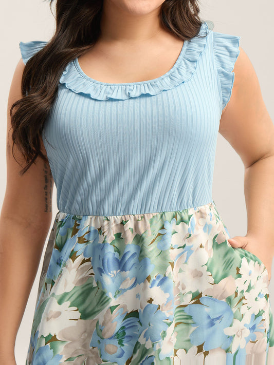 Floral Print Ribbed Stretchy Waist Midi Dress