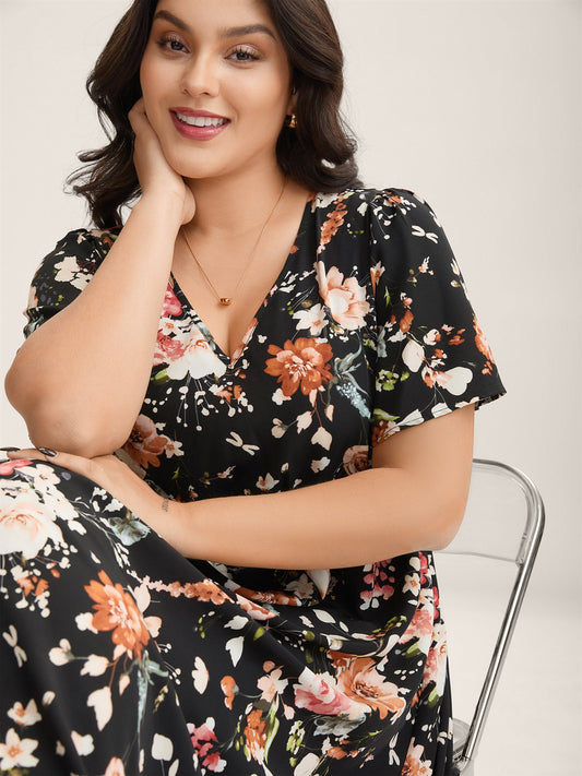 Midnight Florals Cinched-Waist Pockets Midi Dress