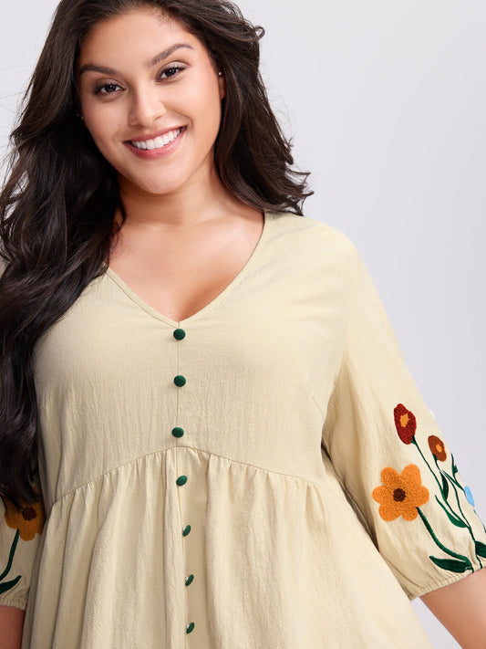 Floral Embroidery Button Front Knee-Length Dress
