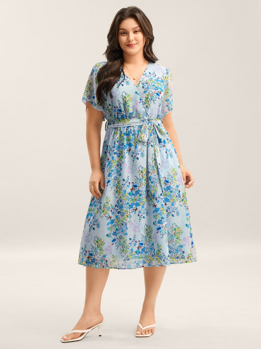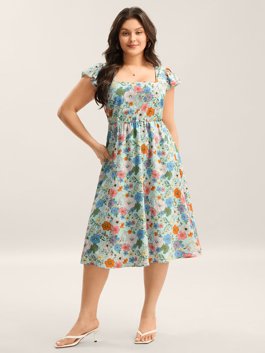 Floral Print Flutter Sleeve Pockets Midi Dress