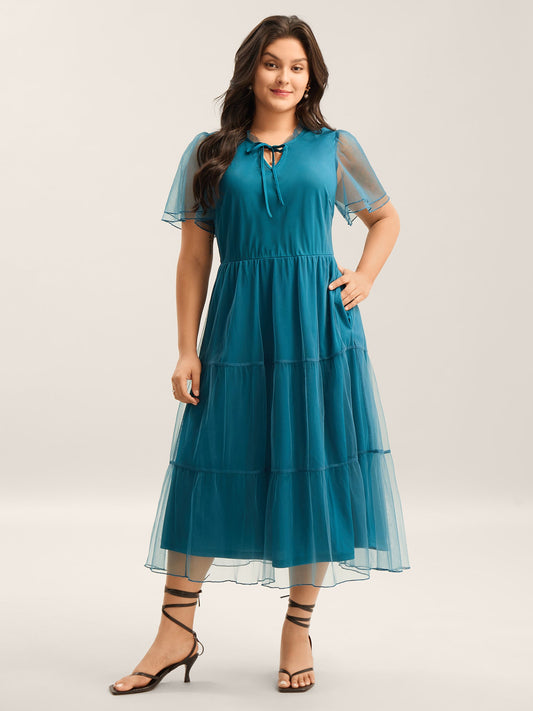 Stretchy Waist Neck Tie Sheer Midi Dress