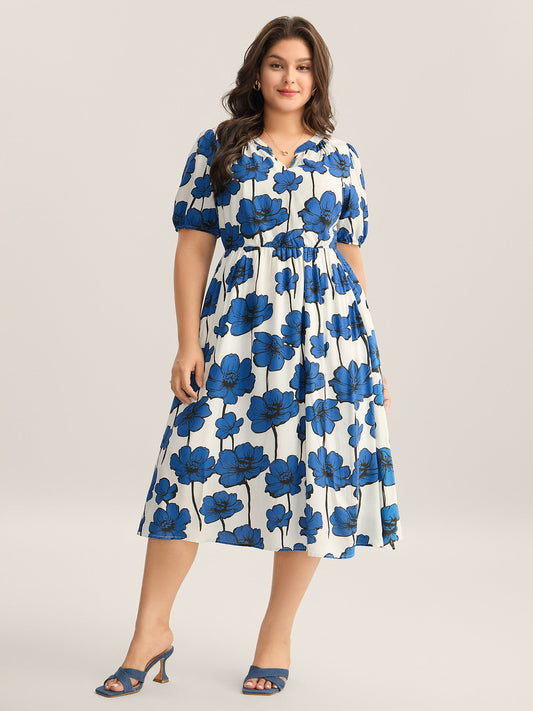 Tropical Print Cinched-Waist Pockets Midi Dress