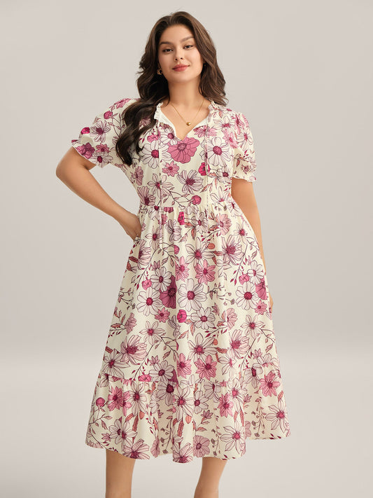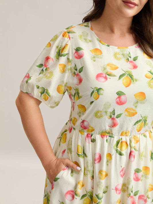Leafy Print Puff Sleeve Pockets Midi Dress