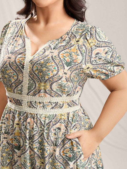 Ornate Print Lace Neck Midi Dress