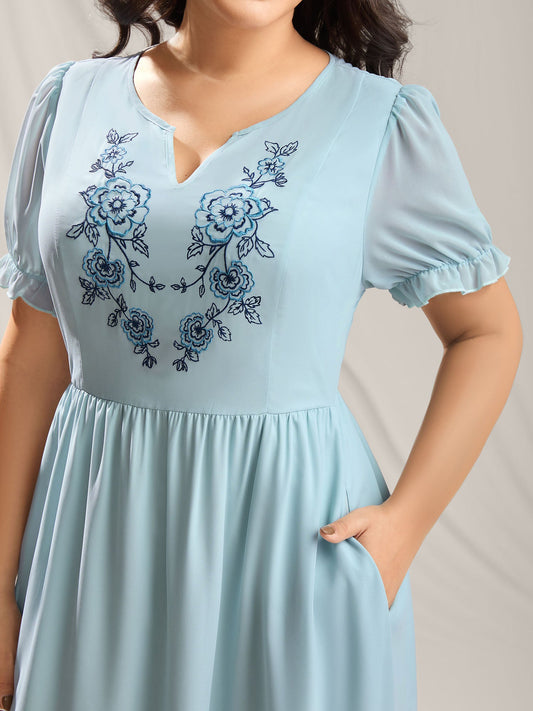 Embroidered Sheer Chiffon Pockets Midi Dress