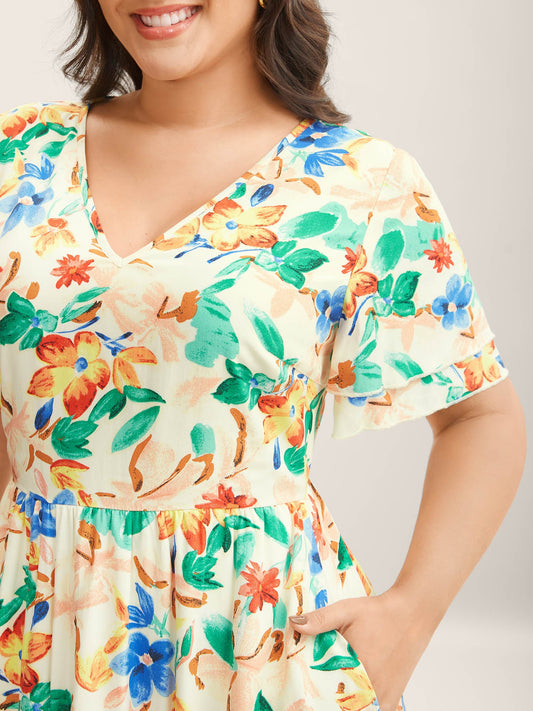Floral Sleeves Spliced Pockets Midi Dress