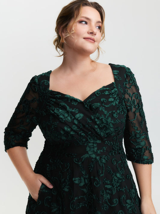 Floral Embroidered Stretchy Waist Pockets Midi Dress