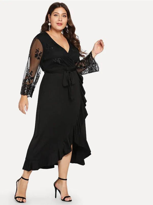 Ruffle Hem Sheer Sleeve Elegant Maxi Dress