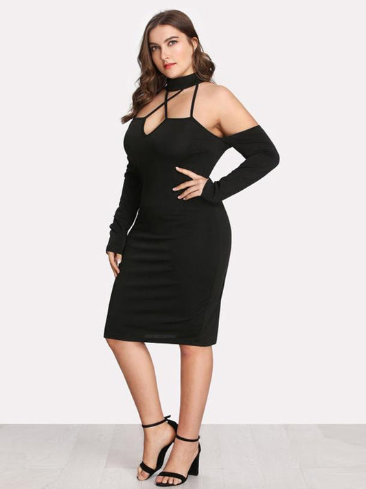 Cold Shoulder Fuzzy Trim Velvet Bodycon Dress