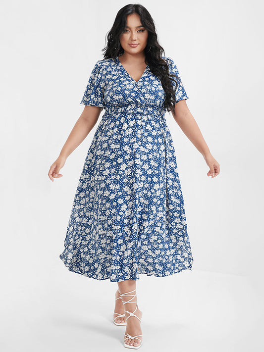 Ditsy Floral Flutter Split Shirred V Neck Dress