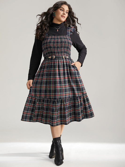 Plaid Ruffle Trim Shirred Spaghetti Strap Dress