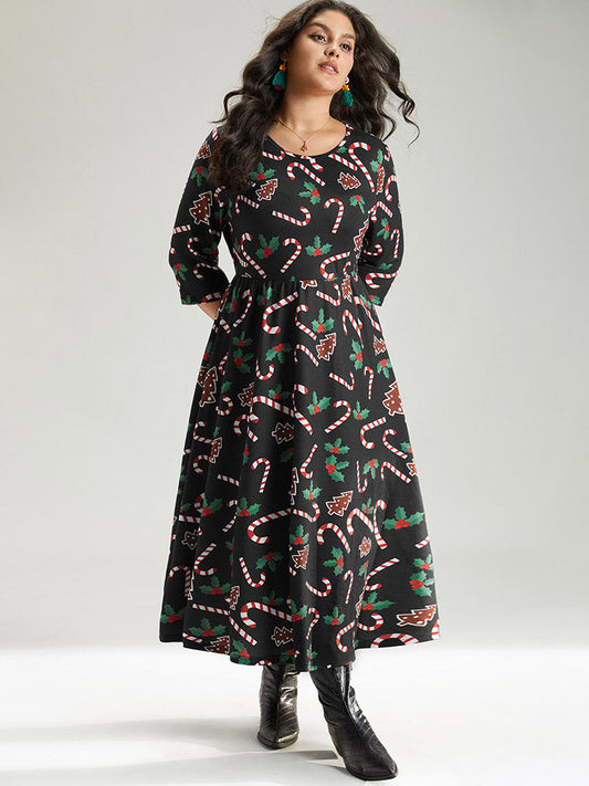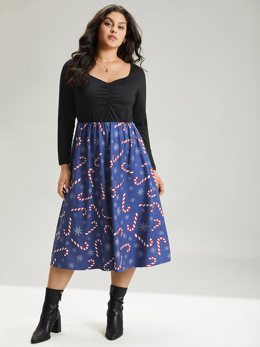 Snowflake & Christmas Candy Print Pocket Ruched Dress