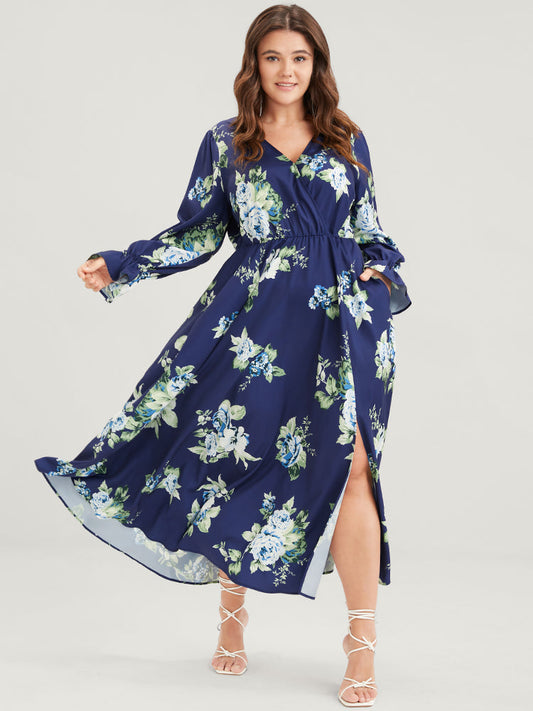 Floral Split Bell Sleeve Pocket Elastic Waist Flutter Wrap Dress