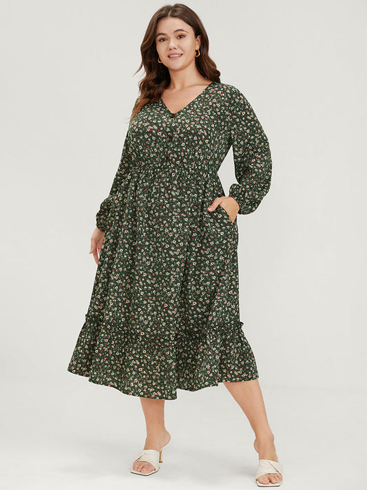 Ditsy Floral Pocket Puff Sleeve Fake Button Ruffles Hem Dress