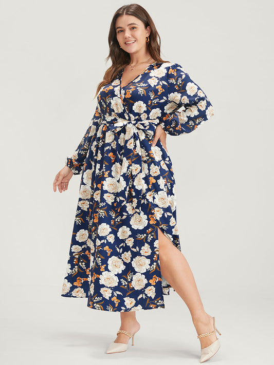 Floral Pocket Lantern Sleeve Split Wrap Tie Midi Dress