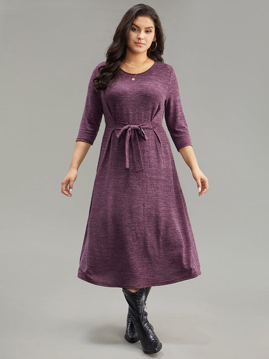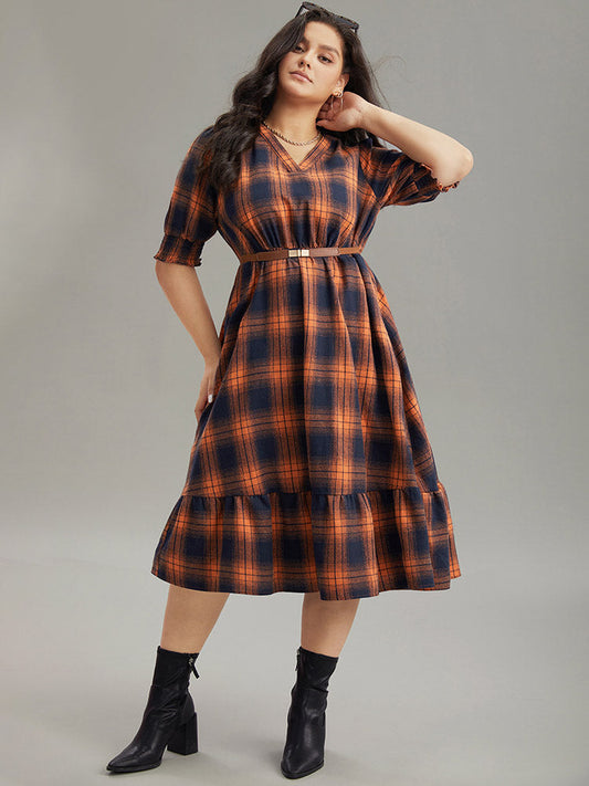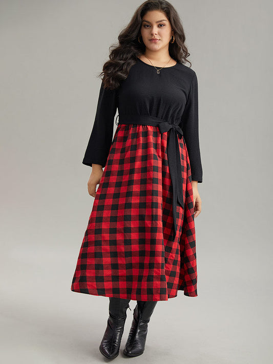Plaid Patchwork Contrast Round Neck Belted Dress