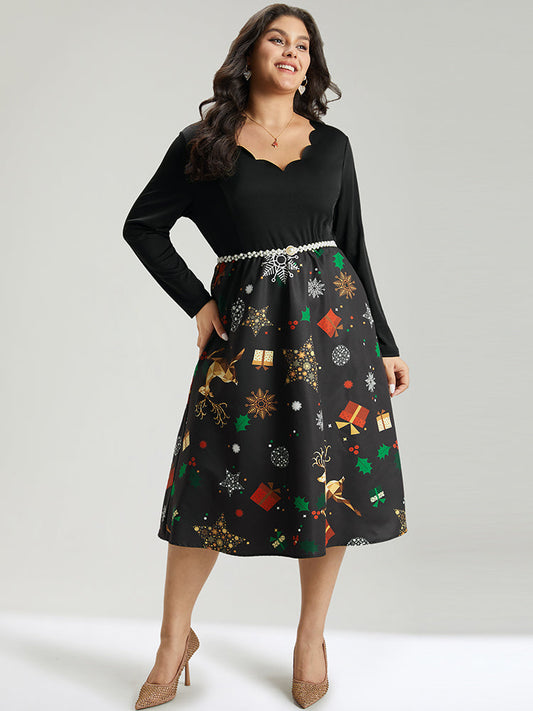 Christmas Print Patchwork Scalloped Trim Elastic Waist Dress