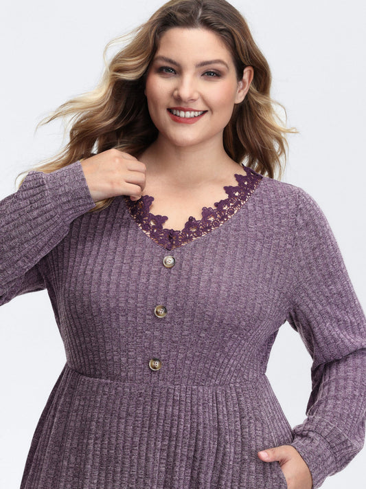 Textured Stretchy Waist Button Sweater Knee-Length Dress