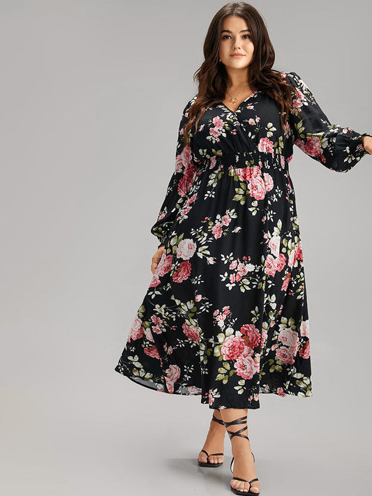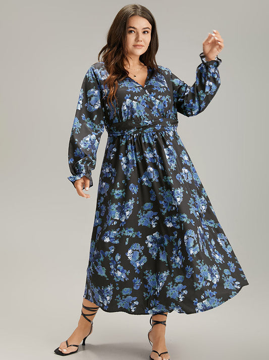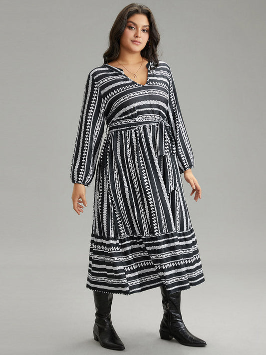 Striped Ties Lantern Sleeve Curved Hem Dress