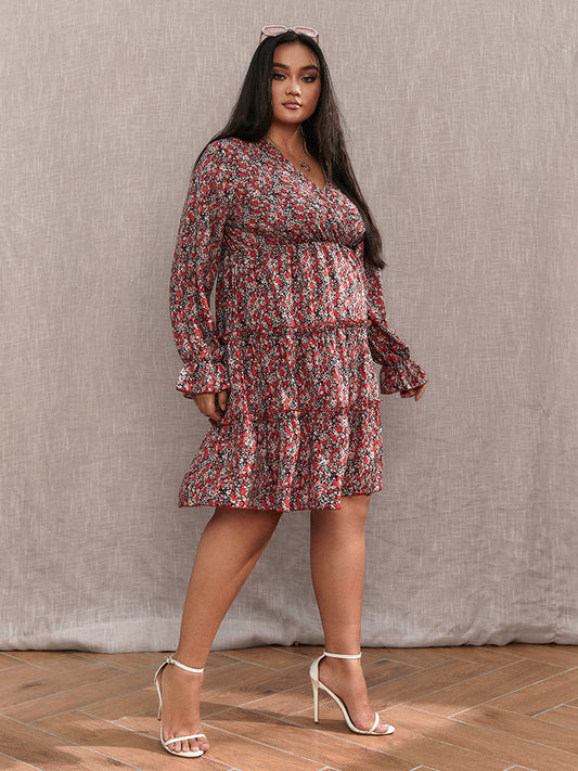 Floral V-Neck Frill Trim Teired Dress