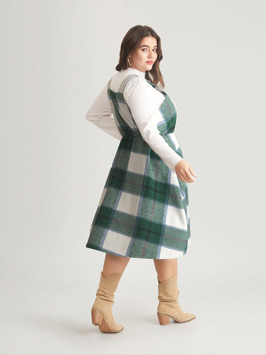 Plaid Elastic Waist Button Detail Adjustable Straps Dress
