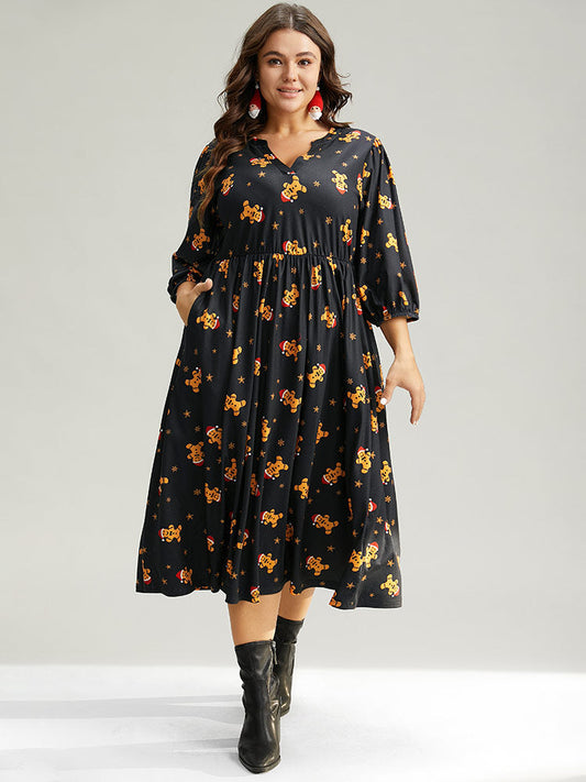 Christmas Print Notched Pocket Elastic Waist Dress