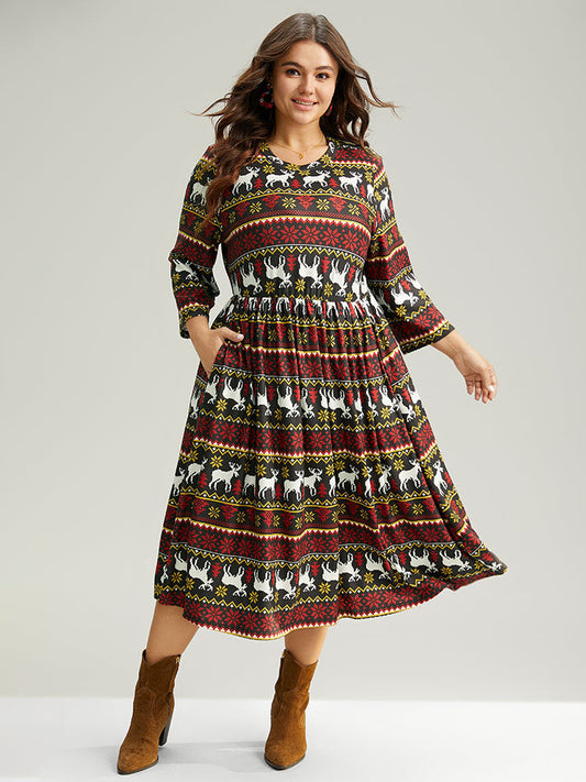 Boho Print Overlap Collar Lantern Sleeve Dress