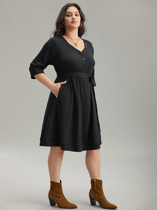 Waffle Knit Button Detail Belted Dress