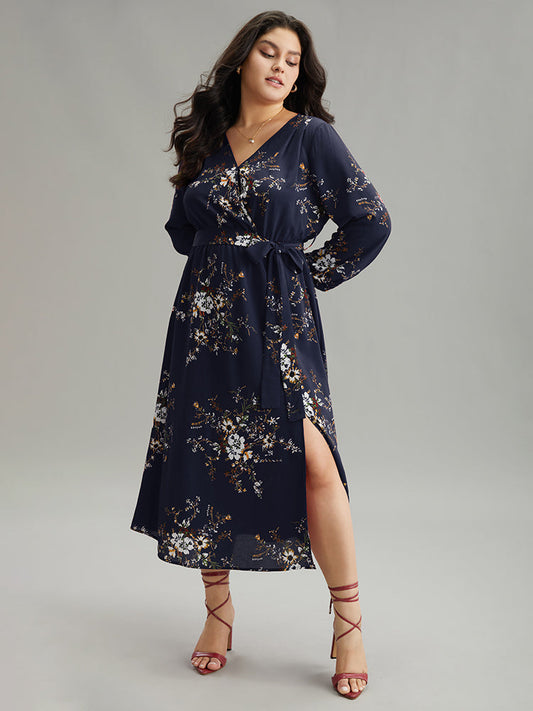 Floral Print Belted Split Surplice Neck Dress