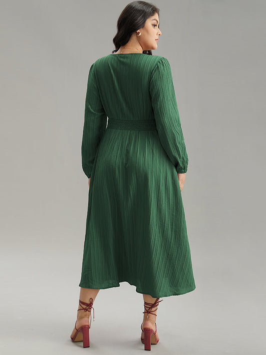 Solid Plisse Button Detail Shirred Dress