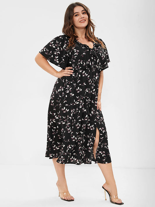 Floral Ruffles Trim Pocket Split Wrap Midi Dress